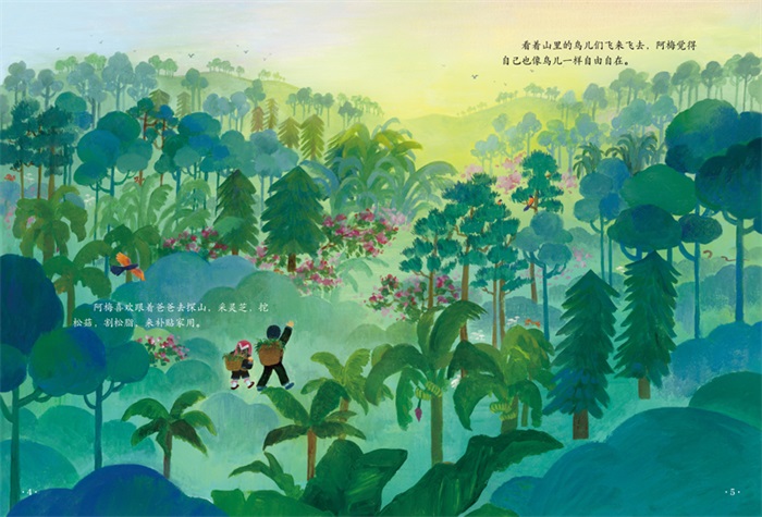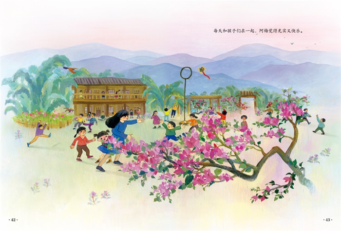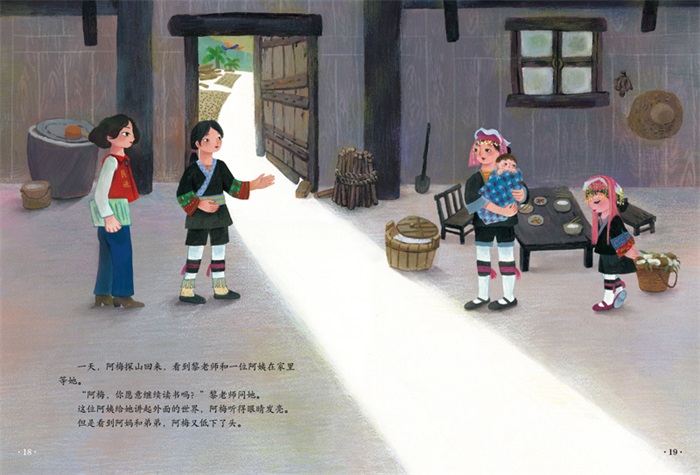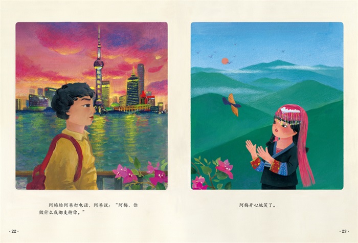 《十万山花开》是一部以教育扶贫为背景创作的现实题材的原创绘本。 广西十万山,流传着一个“女不读书”的落后观念,一个瑶族小女孩阿梅在党和政府的帮助下,走出大山去读书、工作,见识更广阔的世界后,又回到大山,重返校园做老师,继续为其他女孩播洒希望。画风细腻、温暖又蕴含力量,绵延的大山和郁郁葱葱的山林,引人无限遐想,体现了大山深处的女孩对知识的渴求、对外面世界的向往。