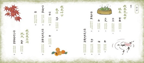 我在花朵中醒来 紫藤 玉兰 兰花 荷 闻见园林 菊 梅 水仙 好吃的观花植物 我在叶下乘凉 观叶 竹子 听见园林 柳 松 好吃的观叶植物 我在果实间跳跃 观果 好吃的观果植物 我在几案上睡去 案头上宾 插花 瓶 鬼火保温瓶 上古酒器我来插花 爱瓶护花 簪花 冬日里的园林美食