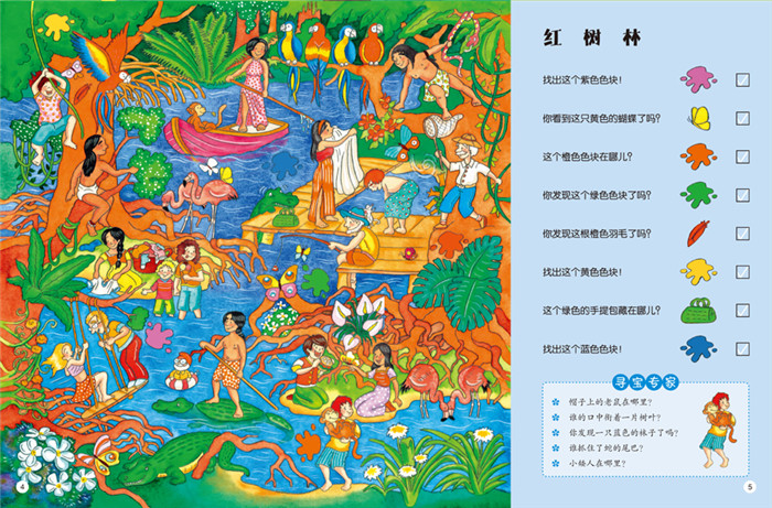 为了鼓励孩子发现线索,游戏类大画册设计了“普通任务题”和 “寻宝专家”栏目。每完成一项普通难度的任务,孩子便可勾选、标记,帮助他们培养做事情的条理性并获得成就感;“寻宝专家”通过问题提示,引导孩子通过观察、分析来寻找答案,具有鲜明的益智游戏特征,在潜移默化中培养他们的逻辑思维能力、观察力和专注力。