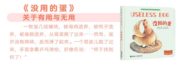 《没用的蛋》是“没想到幼儿哲学启蒙绘本”系列中的一本,讲的是一个“蛋”的故事,先是母鸡捡到了它,因为没有变成小鸡而被遗弃;接着被鸭子带回了窝,遭受了同样的命运;后来又被喜鹊当成宝贝。可是在漫长的等待中,它始终没有变成小喜鹊,恼怒的喜鹊妈妈将这个没用的蛋从高高的枝头扔下。可是,这一定是个“蛋”吗?真相是它其实是个乒乓球。