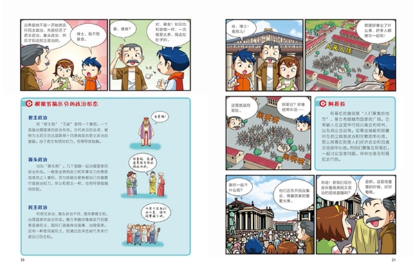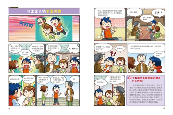 “大英儿童漫画百科”是经大英百科全书公司权威授权、大英百科研究部门审核内容,采用最新的图形和绘制技术精心打造,以孩子们的兴趣点为中心,完整构建十大知识领域,全方位满足少年儿童的知识需求。该丛书以《大英百科全书》的内容知识为基础,形式活泼有趣,为孩子深入浅出地讲述相关科学知识。本文稿的知识主题是“政治”。文稿从罗云想通过给朋友买炒年糕竞选班长的事情说起,罗云的朋友美琪为了帮助罗云正确认识竞选的含义和意义,带罗云认识了政治热博士——一名热心研究如何帮助孩子有趣学习政治的政治学专家。通过一次次特殊的政治学习之旅,罗云和美琪深入了解到政治的历史发展、政治的理念和形态、法律和政治参与等知识内容。故事内容丰富有趣,知识性强,寓教于乐,可以带领孩子开启愉快有趣的政治学习体验。