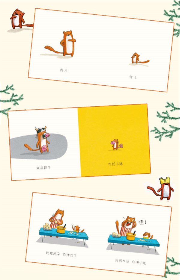鼬鼠有一只小鼬鼠,他们相互陪伴、一起玩耍,小鼬鼠模仿大鼬鼠的各种动作。它们一起扮演奶牛、小猪,一起踢球,一起做饭、吃饭,一起看书画画……本书通过对生活的细腻观察和许多日常生活瞬间的捕捉,配合节奏感极强、凝练、幽默的文字向我们展示了“大人与小孩”之间的真实关系以及大鼬鼠和小鼬鼠之间浓浓的爱。