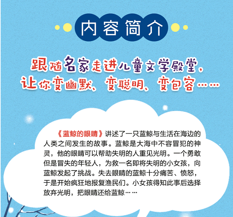《蓝鲸的眼睛/注音版儿童文学名家精选书系》是我国儿童文学作家冰波的短篇童话集,包括《树叶鸟》《耳朵上的绿星》《红女巫》《小青虫的梦》《蓝鲸的眼睛》等,其中《蓝鲸的眼睛》讲述了蓝鲸是大海中不容冒犯的神灵,它的眼睛可以帮助失明的人重见光明。一个勇敢但是冒失的年轻人,为救一名失明的小女孩,向蓝鲸发起了挑战,蓝鲸失去了一只眼睛,痛苦、愤怒涌上心头,开始疯狂地报复渔民们。小女孩得知此事后选择放弃光明,把眼睛还给蓝鲸。而少年独自一人乘船出海,他以自己的鲜血以及生命,洗净罪恶。蓝鲸的灵魂升到天上,它将一双美好的眼睛留给了女孩。
