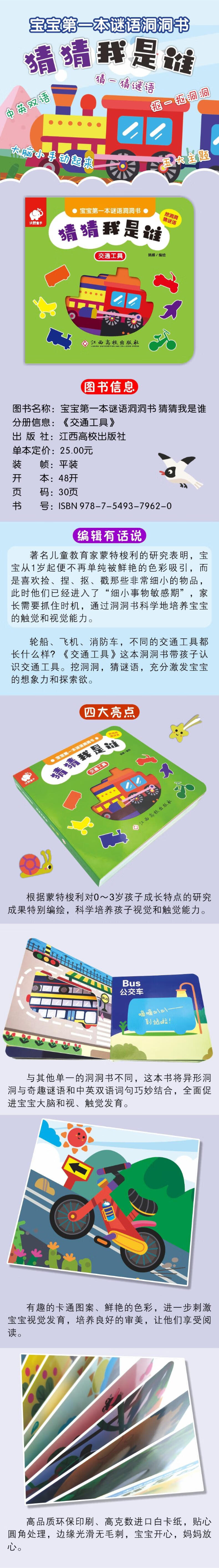 轮船、飞机、消防车,不同的交通工具都长什么样?《交通工具》这本洞洞书带孩子认识交通工具。挖洞洞,猜谜语,充分激发宝宝的想象力和探索欲。
