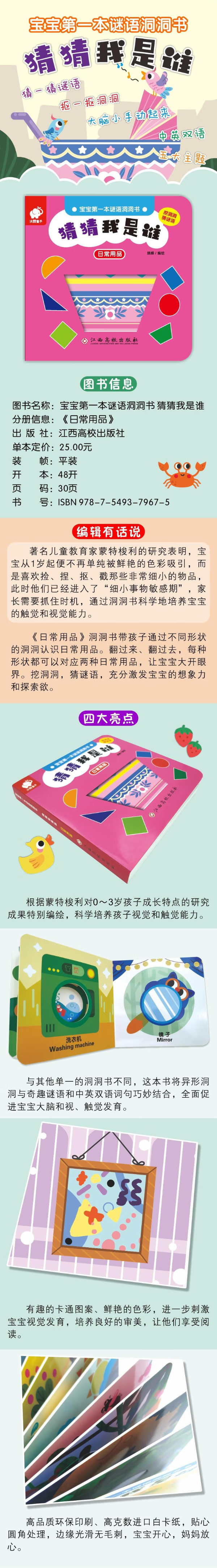 《日常用品》洞洞书带孩子通过不同形状的洞洞认识日常用品。翻过来、翻过去,每种形状都可以对应两种日常用品,让宝宝大开眼界。挖洞洞,猜谜语,充分激发宝宝的想象力和探索欲。