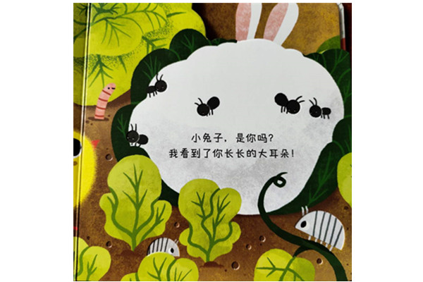 本书中有5处洞洞,透过前面4个洞洞可以看到跳动的小爪子、偷偷张望的眼睛、毛茸茸的尾巴、长长的大耳朵,每次就在宝宝以为找到小兔子的时候,翻开却是意外的发现,让宝宝的阅读过程惊喜不断;书中有大量精细的模切图形,葡萄、花朵、蚯蚓、蝴蝶的翅膀等都刻画得细致入微,在宝宝眼前呈现出一个可以看可以摸的奇妙世界,宝宝可以在探索感知中锻炼小手灵活性。