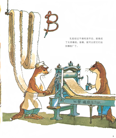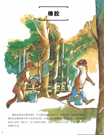 (1)43张拟人化的跨页图画风萌趣,用小动物来当主角,一步一步地制作橡胶、油漆、蜂蜜等生活常用品,与孩子的童趣视角相契合,激发3~6岁孩子的好奇心。