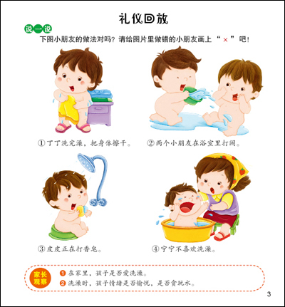 要让幼儿成为一个讲文明、懂礼貌的人,使幼儿拥有一个健全的人格和自信的人生,早期的引导和教育尤为重要。这套《幼儿礼仪教育》从幼儿的阅读习惯和实际的生活场景出发,让幼儿在唱儿歌、做游戏等寓教于乐的形式中,学习“基本礼仪”“家庭礼仪”“幼儿园礼仪”“公共场所礼仪”“节日礼仪”五方面的内容,培养幼儿养成各种礼仪的好习惯。