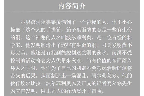 小男孩阿尔弗莱多遇到了一个神秘的人,他不小心撞翻了这个人的手提箱,箱子里面装的竟是一些有生命的洞。这个神秘的人名叫波尔菲利奥,是一位古怪的科学家,他发明制造出了这些有生命的洞。只是发明尚不尽完美,他还没有找到能控制这些洞的药水,而洞不受控制的活动将会为人类带来灾难。当有价值的东西落入坏人之手时,他们为了自己的利益不会考虑活跃的洞将带来的后果,从而制造出一场混乱。阿尔弗莱多、他的伙伴埃尔比拉、波尔菲利奥以及正义的记者赛尔修先生为完善发明,阻止坏人的行动展开了冒险。