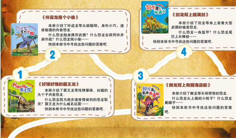 《幼儿恐龙大图鉴》一共8册,包含近80种“明星恐龙”。书中用轻松有趣的文字描绘这些恐龙生活的方方面面,同时,精美超清的全景大图与幽默诙谐的情景漫画相结合,带给小读者新鲜的视觉感受,让他们轻松成为“恐龙小专家”。
