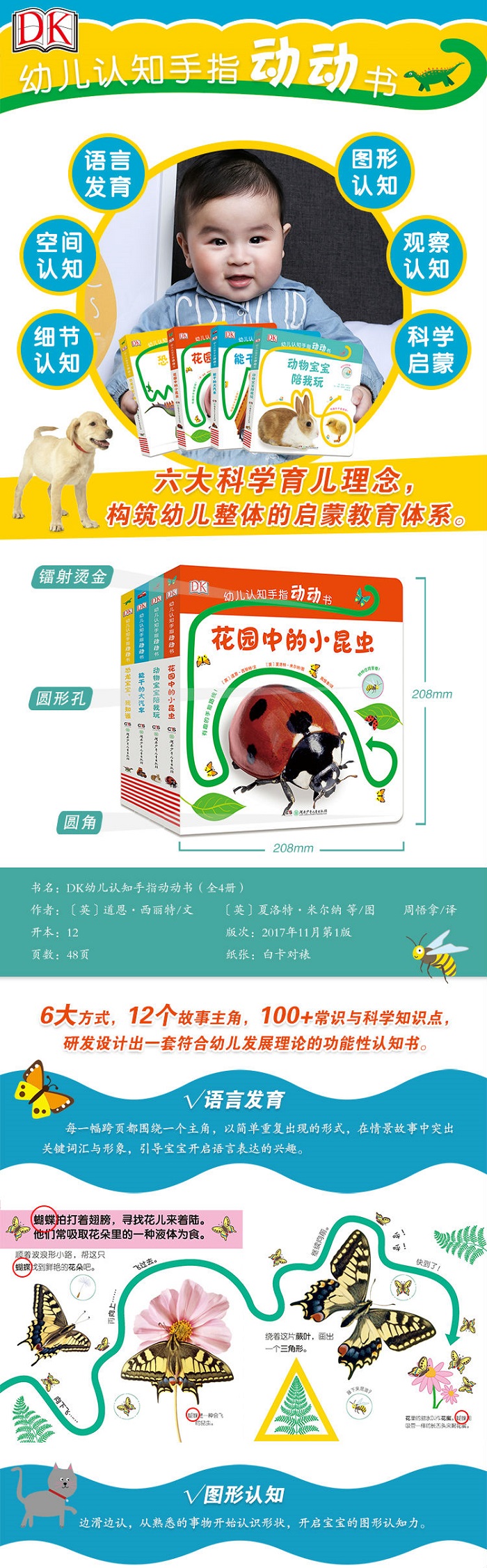 ◆《DK幼儿认知手指动动书·花园中的小昆虫》——让可爱的小宝贝动动手指,开启探索这个世界的第一步吧!跟随色彩缤纷的路线轨道,猜猜小昆虫要飞到哪儿去!