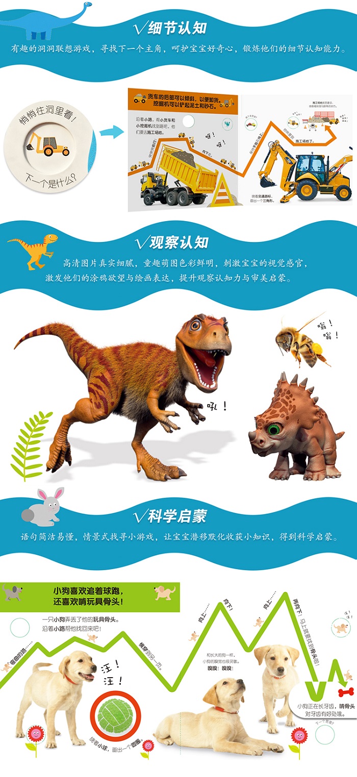 ◆《DK幼儿认知手指动动书·恐龙宝宝,我知道》——让可爱的小宝贝动动手指,开启探索这个世界的第一步吧!跟随色彩缤纷的路线轨道,找出恐龙宝宝们谁的脖子非常长,谁的脑袋又大又长角!
