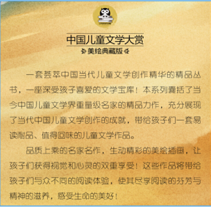 《中国儿童文学大赏》是一套经典的儿童文学作品,均出自名家,如沈石溪、张秋生等。作品内容质量好,文学价值高,非常适合中小学生阅读。该系列不仅能开拓孩子的视野、增长知识,还能提高其文学素养,让他们从这些文学作品中感受语言文化的魅力,收获人生启迪。 《周锐童话专集 竖着爬的小螃蟹》精选了周锐的童话作品。周锐在作品中经常会“神来一笔”,童话结局出乎意料,却又在情理之中,让小读者既能充分体会到阅读的快乐,又能收获人生哲理。(该作品已获得作者授权。)