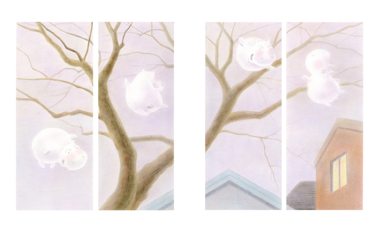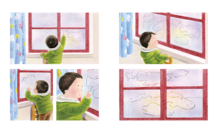 《哈气河马》是一本无字书,用冬天特有的热腾腾的哈气,讲述了一个清晨发生在母子之间的故事。全书构图分为上下两条线索,在写实的绘画中融入幻想的趣味,全书的场景下半部分是清晨孩子起床,出门,母亲送孩子上幼儿园,从家到幼儿园一路的经历,是无数个冬日清晨万千家庭清早生活的缩影;而上半部分则归属于孩子的内心世界,作者用冬日里*常见的哈气,从孩子的视角出发,为孩子幻化出了一个“哈气河马精灵”朋友,在母子的行进中,这位隐约伴随陪伴的哈气河马也开始了自己的一场人间冒险。