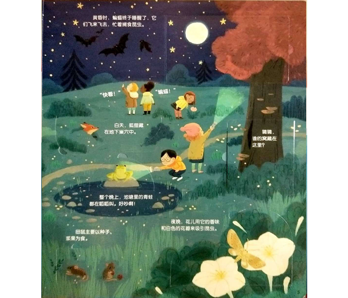 夜晚不仅有好多还在工作的人们,还有很多有趣的动物也在活动,本书通过多重趣味翻翻页,激发孩子阅读兴趣,自主揭秘,能让小朋友学习到很多与夜晚有关的知识和生活常识,培养他们的观察能力、认知能力和科学兴趣,促进他们的健康发展。