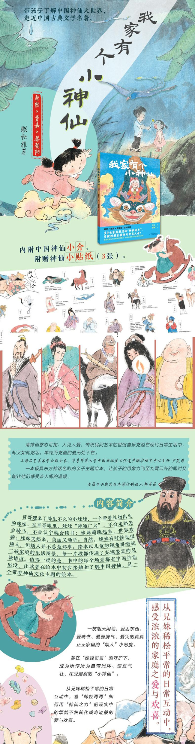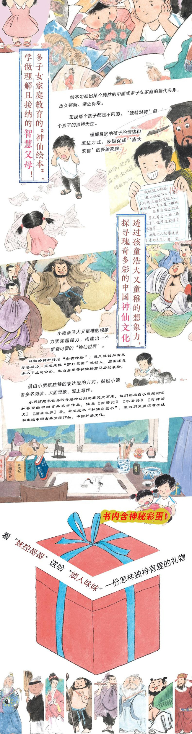 哥哥迎来了降生不久的小妹妹,一个带着礼物出生的妹妹。在哥哥眼里,妹妹“神通广大”,不会走路先会骑马,不会认字就会读书;妹妹蹦跳起来,世界欢腾;妹妹哭起来,美丽又动听。当然,妹妹有时候也很烦人,但烦人并不总是坏事。绘本以儿童的视角拼缀起二孩家庭的生活图景,每一片段都传递了充满爱意的兄妹情谊。值得一提的是,书中的每个场景都有中国神仙出没,让读者在绘本中初步接触和了解中国神仙,是一个带有神仙文化主题的绘本。