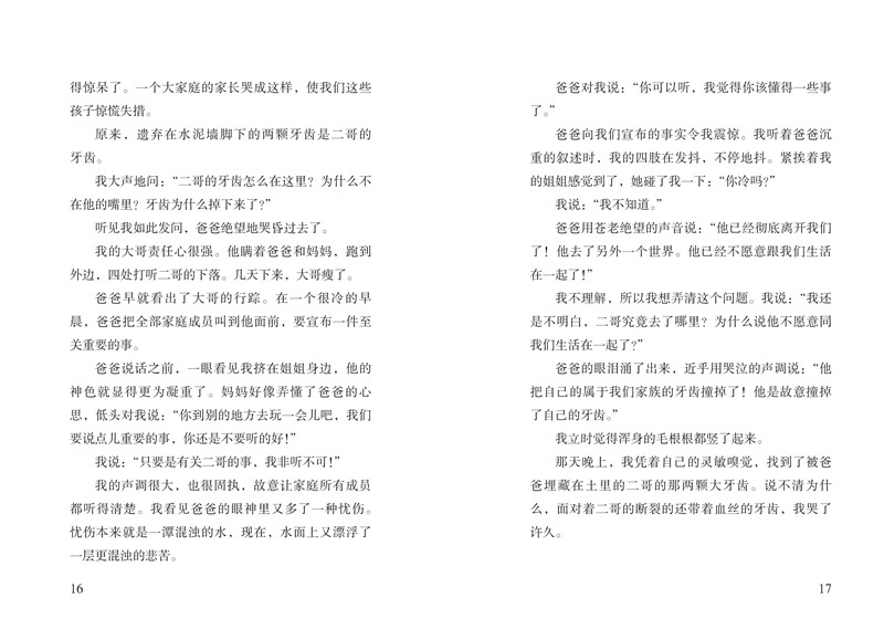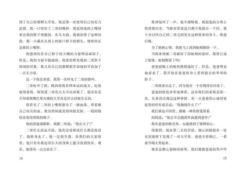 我听不见爷爷跟爸爸究竟说了些什么,但是我感到他们的谈话内容一定跟我有关。我看见爸爸回头看了看我,让我把一块带肉的猪骨头叼走。爷爷知道我是这个家族中最小的,也是长身体急需营养的时候。爷爷知道我心里想的是什么。我叼起了那块猪骨头经过二哥的身边时,我也听见了他从嗓子里发出的咕噜声和粗重的呼吸。当我还在一旁认真地啃那块骨头时,爷爷又一次昏迷过去了。当大家围拢在爷爷身边时,二哥突然蹿到我身边,伸出他的红舌头带着一股仇恨咬了一口我的猪骨头。