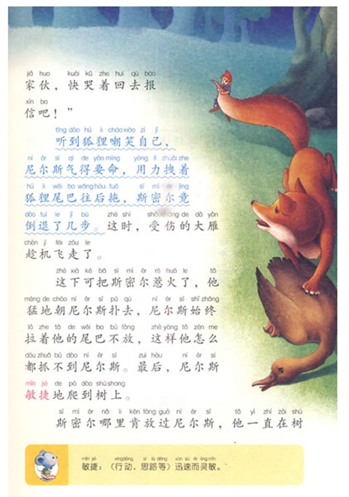 《尼尔斯骑鹅旅行记》写的是一个名叫尼尔斯的14岁男孩,家住在瑞典南部,父母都是善良、勤劳却又十分贫困的农民。尼尔斯不爱读书学习,调皮捣蛋,好捉弄小动 物。一个初春,他在家里因为捉弄一个小精灵而被变成一个拇指般大的小人儿。小尼尔斯骑在鹅背上,跟随着大雁走南闯北,周游瑞典各地,看到了自己祖国的奇峰异川、旖旎风光,学习了祖国的地理历史,听了许多故事传说,也饱尝了不少风险和苦难。在漫游中,他从旅伴和其他动物身上学到了不少优点,逐渐改正了自己淘气调皮的缺点,培养了助人为乐的优秀品德。当他重返家乡时,不仅重新变成了一个高大漂亮的男孩子,而且成了一个温柔、善良、乐于助人且又勤劳的好孩子。