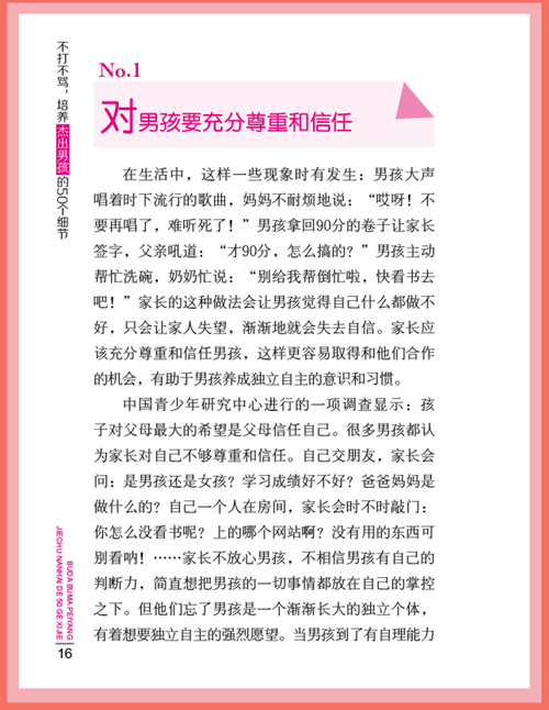 本书对培养杰出男孩的教育方法进行了详尽论述,旨在让男孩多经历风雨,让他们变得成熟坚忍,逐渐成长为适应时代潮流的男子汉