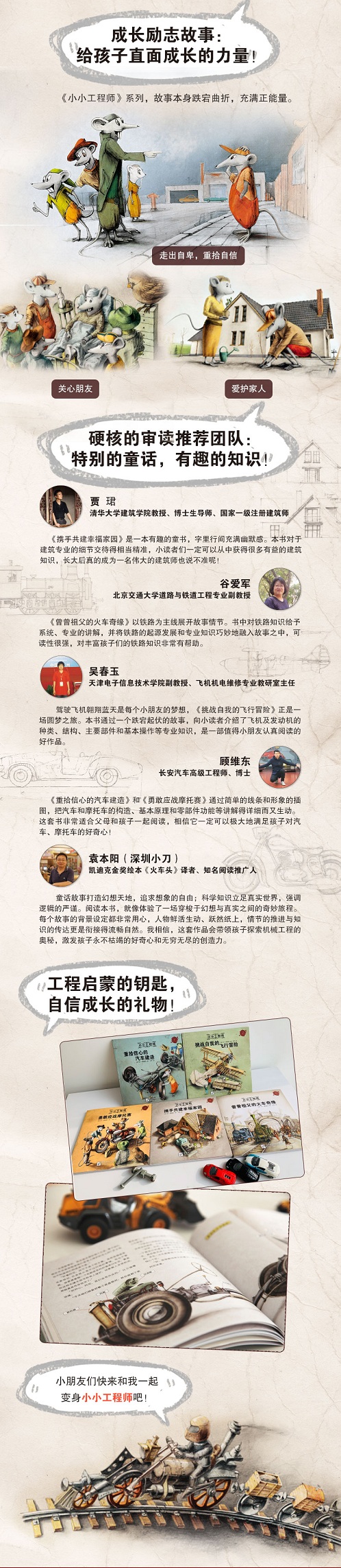 《小小工程师》系列是一套机械工程类的童话故事,分为5册,分别围绕着铁路、汽车、飞机、摩托、房屋的建造过程展开。全书以老鼠、青蛙和麻雀为主要形象,主要讲述了老鼠阿尼和他的朋友露茜、托尼、帝奇、弗雷德,还有麻雀比尔、青蛙克里斯蒂安等,通过学习机械工程知识,紧密团结协作,成功建造汽车、飞机、摩托以及房屋的故事,它们在建造过程中不但战胜了对手杰克,更是完成了对自我的挑战。其中讲述铁路工程的单册,主要围绕着老鼠阿尼的曾曾祖父以及其他相关角色展开。这套书故事生动曲折,对机械工程知识的讲解深入浅出,便于理解。