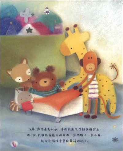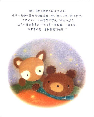 睡吧,睡吧,我亲爱的宝贝。一只悲伤的小泰迪牵动了大家的心,为了让他重获快乐,玩具们踏上了寻找之旅。他们知道,小泰迪需要的不只是一身衣服和一张小床。他们翻“山”越“岭”,渡过“海洋”,攀上最高的“山峰”……终于带回了让小泰迪快乐的秘密。 无论是画面还是文字都让年幼的小读者体会了到友情的温暖。 人生的道路固然崎岖颠簸,但朋友们温柔而执着的关切,会帮助我们克服重重困难。无论是友情,还是亲情,这份温暖将带给孩子甜蜜的梦。
