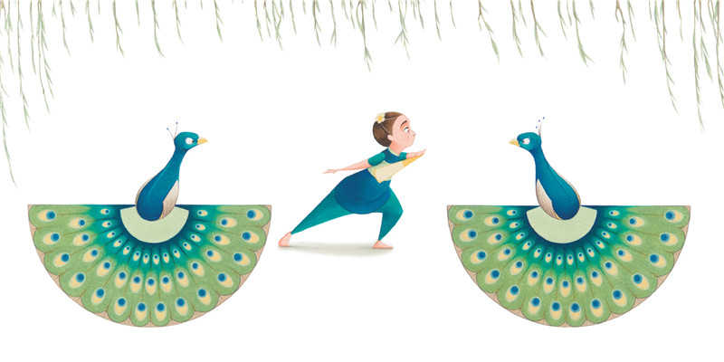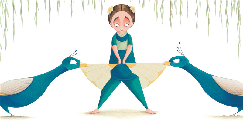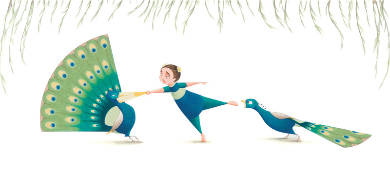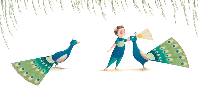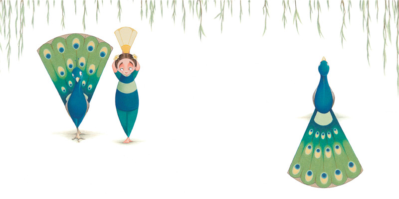 现在,莫莉又创作了《弗洛拉和孔雀》,这本的色彩主调呈现的是孔雀羽毛的颜色,蓝色与绿色,因此弗洛拉的衣服也变成了蓝绿相间,彷佛是一只小孔雀,正想开屏翩翩起舞,再加上绿色垂柳,整本书绿意盎然,无限生机。