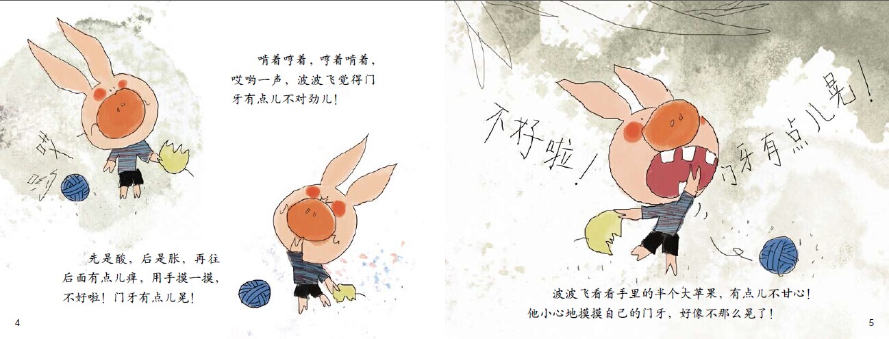 过了好久,一天,波波飞在吃最爱吃的苹果时把一颗门牙崩掉了,他哇哇大哭跑回家,妈妈告诉他:这叫换牙,每个小朋友都有这个经历。还教他把牙埋在柳树下,晚上波波飞做了个梦,梦见他的牙长成了一座高高的牙山……