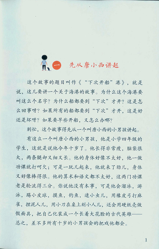《“下次开船”港》是作家严文井的经典童话作品,讲了小学生唐小西挥霍时间,让时间小人儿生气出走,他自己也被带到“下次开船”港。后来,他与玩具小伙伴们一起营救朋友,并懂得了珍惜时间的道理,成功把时间小人儿请回来了。“下次开船”也变成了马上开船。近期,教育部基础教育课程教材发展中心发布了针对中小学的阅读指导目录,《“下次开船”港》也在其中。这篇童话积极向上,具有教育意义,适合小学生阅读。这本书属于“教育部中小学生阅读指导书系”,配合新发布的阅读指导目录,在文前增加“读前准备”“阅读建议”,文后加“读后闯关”,帮助读者理解作品,掌握阅读方法,完成阅读活动,因此,也能成为教师“整本书阅读”的优质教学材料。