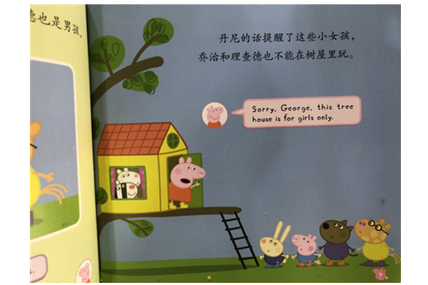 树屋真好玩,可是佩奇规定只让女孩进来。城堡也很有趣,丹尼却规定只有男孩能进来。后来,女孩们终于来到了城堡里,男孩们也躲进了树屋避雨,大家都体验到了另一种乐趣。而且,大雨带来了泥坑,男孩女孩们又一起开心地玩了起来。