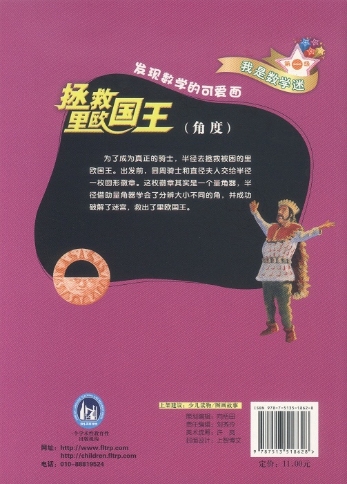 《拯救里欧国王》(知识点:角度)为了成为真正的骑士,半径去拯救被困的里欧国王。出发前,圆周骑士和直径夫人交给半径一枚圆形徽章。这枚徽章其实是一个量角器,半径借助量角器学会了分辨大小不同的角,并成功破解了迷宫,救出了里欧国王。