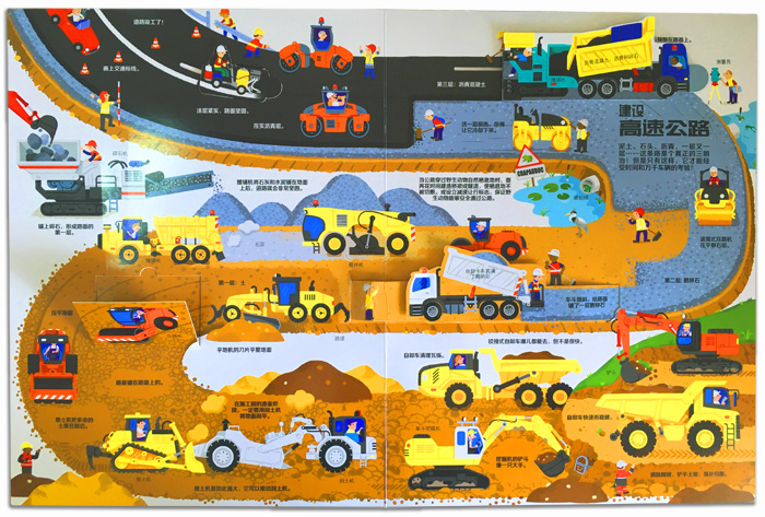 对于年龄稍大、有一定社会知识积累的孩子,这更是一本理想的亲子阅读读物。家长可以帮助孩子朗读书中的名词和注释,由于本书专业性强,文字较为简约,对孩子感兴趣的部分,还需要家长做进一步的解释。此外,由于每个主题是现实场景的直观展示,并非按普通阅读顺序设计,所以家长不妨提前浏览做好功课,按照每一个大工地特定空间布局和施工步骤引导孩子阅读。当然,孩子有自己的认知方式,他们往往不在意逻辑关系,而是随心所欲地去发现和学习。我们尽管尊重他们的习惯方式,只是在他们需要帮助的时候,给予恰当的解释和帮助,真正让他们享受玩具书的乐趣。