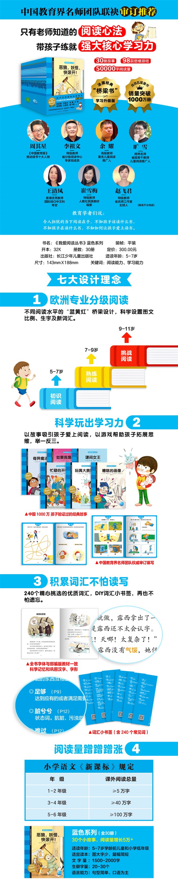 《我爱阅读丛书》(学习升级版)全套系共90册,蓝黄红分别各30册。这是一套面向5-11岁儿童,由欧美知名作家、专业绘本家联袂打造的桥梁书。桥梁书是一种让孩子从绘本、拼音本过渡到正常阅读的必备读物。与其他桥梁书不同的是,《我爱阅读丛书》(学习升级版)采用不同阅读水平的“蓝黄红”桥梁设计,译文生动流程,完整还原欧美故事思维,同时科学设置图文比例、生字及新词汇,并配有中国教育界名师团队编写的思维拓展训练游戏,小心呵护孩子的阅读兴趣,是孩子真正跨过阅读门槛、实现阅读独立的成长里程碑。