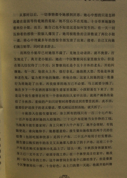 读托尔斯泰的《复活》,我感觉他的确了不起。他笔下的妓女玛斯洛娃给人一种圣洁之感,而我们有些小说的所谓“圣洁女性”形象却给人卑琐之感。这就看出大师与普通作家之间的差别了。