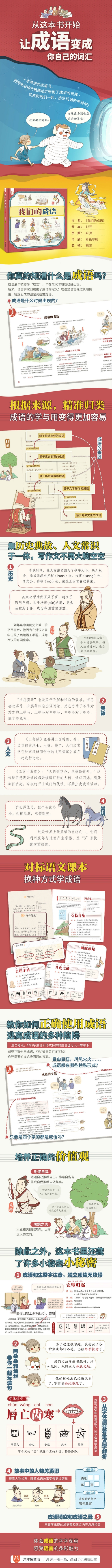 《我们的成语》可不只是一本讲成语故事的书,里面还包含了成语是什么、成语的来源等关于成语的基础知识和与成语故事相关的各种小知识,让孩子们可以在读成语故事的同时,了解更多藏在成语背后的知识。本书中的成语均出自成语词典,来源出处准确,内容贴合历史,再配上和成语相关的手绘画面,图文相依,让孩子们不再为课本中出现的成语所扰,可以轻轻松松地学习成语。
