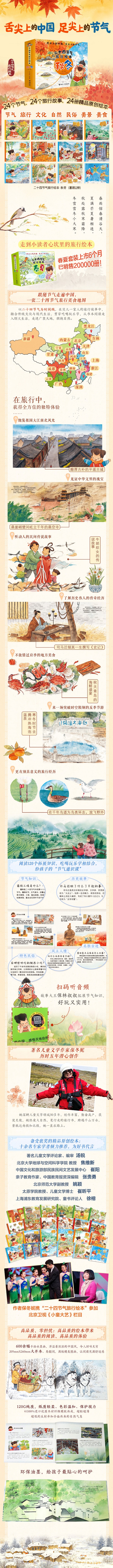 二十四节气是我国历法的重要内容,和老百姓的日常生活也有密切的联系。但并不是每个人都系统的了解二十四节气,一般只知道个别节气。本书以讲故事的形式系统地介绍了二十四节,而且图文并茂,具有亲和力,充满浓浓的乡土气息。这套书还融入了自然教育和旅行教育的理念,带领读者从书本走向生活,走进自然,将儿童知识的空白点穿插在旅行故事中。使该系列书具有知识性、趣味性和可读性。该书的出版,将给青少年带来丰富的科技大餐,不仅使青少年获得知识,而且会使他们更加热爱科学。这套系列书对成人也具有重要的参考价值。 ——北京大学地球与空间科学学院 教授 焦维新 书中的故事饱含团圆、和睦、敬老、敬畏自然等中华传统美德中的思想与情感,快乐中充满温情,洋溢着当代中国普通百姓生活的美满与幸福。作者保冬妮在这套书的创作过程中,融入了自己对增强传统文化知识传播的理解和思考。她坚信知行合一才能达到阅读和教育的*效果。在旅行中,追求愉悦的体验是每个人更是每个孩子的天性,所以这套二十四节气的旅行绘本,既是舌尖上的中国,也是足尖上的中国。 ——著名儿童文学评论家、编审 汤锐 作者对怎样介绍二十四节气,如何选取和描述典型民俗事项,以及设计时空场景都颇费苦心,不仅从空间上丰富和深化了我们对二十四节气的认识,也将情与理、知与行完美地结合,跃然纸上。 ——中国文化和旅游部民族民间文艺发展中心 崔阳 读完“二十四节气旅行绘本”系列,每个孩子想必更加认同中华传统文化、热爱自己的祖国,更愿意亲近土地、了解历史,*终完成自己与大自然的内在联结,成为一个拥有文化自信、脚下有根、心中有未来的中国人。 ——文学博士、亲子教育作家、中国教育报资深编辑 张贵勇 这套“二十四节气旅行绘本”系列展现了中国二十四个城市和乡村的风土人情,融入了节气知识、民间习俗、历史文化、农事活动和饮食娱乐等内容,可谓“百科全书式”的儿童科学故事绘本,体现出科学性、人文性、艺术性和趣味性的巧妙结合。 ——北京师范大学副教授 姚颖 阳和启蛰,品物皆春。“二十四节气旅行绘本”系列可谓与节令*为匹配的儿童读物。意在陪伴孩子们走过四季,读懂中华民族传统的二十四节气,并由此开启阅读中的四时八方之旅。 ——太原学院教授、儿童文学博士 崔昕平 顺天时,遵物道,讲节气,这是我们应有的中国范儿,也是我们的祖先与时间默契交流的智慧。我们生活在时间和空间里。好的绘本,是重新构建一个尺度,一个通道,让眼睛和心灵慢慢打开,拥有更多的看见的能力。 ——上海浦东教育发展研究院、童书评论人 徐榕