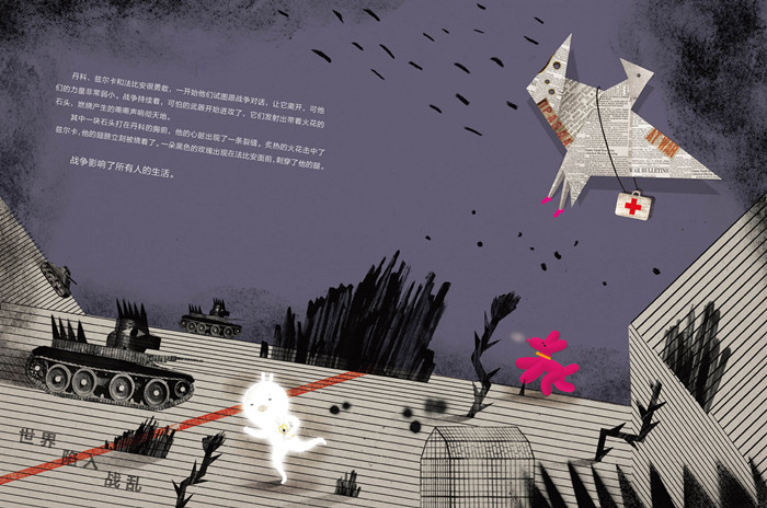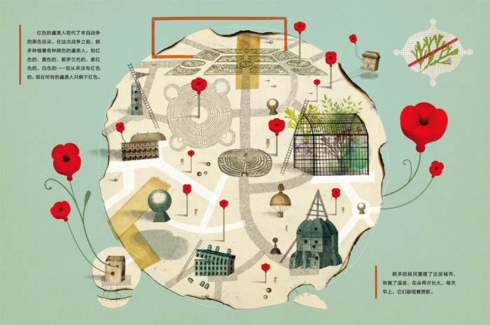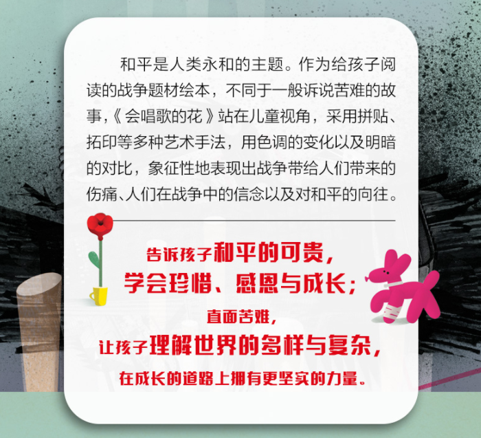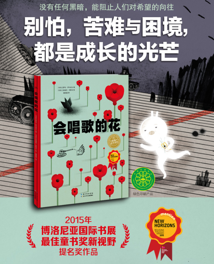 大奖大师绘本,博洛尼亚书展推荐童书奖新视野提名奖,图画美到发光,让孩子理解和平与希望,学会珍惜、感恩与成长。 和平是人类永和的主题。作为给孩子阅读的战争题材绘本,《会唱歌的花》另辟蹊径,用儿童视角讲述故事。作者将三位主角闪灵侠丹科、纸鸟兹尔卡和玩具狗法比安设计成孩子常见的玩具形象;对于和平与希望的象征,作者也将其具象化为“会唱歌的花”,当世界和平,它们唱着赞歌;当战争来临,它们便枯萎了。 故事的主线是三个好朋友通力合作,联合镇上的居民,用“光明”对抗那叫做“战争”的“黑暗势力”。这种隐喻和比拟,在一定程度上消解了战争的残酷。那么,他们打败“战争”所用的光芒,到底是什么呢?阅读了这个故事之后,我们可以告诉孩子,这些光芒是勇气、是希望、是对生命的敬畏、是对和平的向往…… 苦难与困境,都是成长的光芒。《会唱歌的花》直面苦难却巧妙地叙述苦难,让孩子理解世界的多样与复杂,在成长的道路上拥有更坚实的力量。