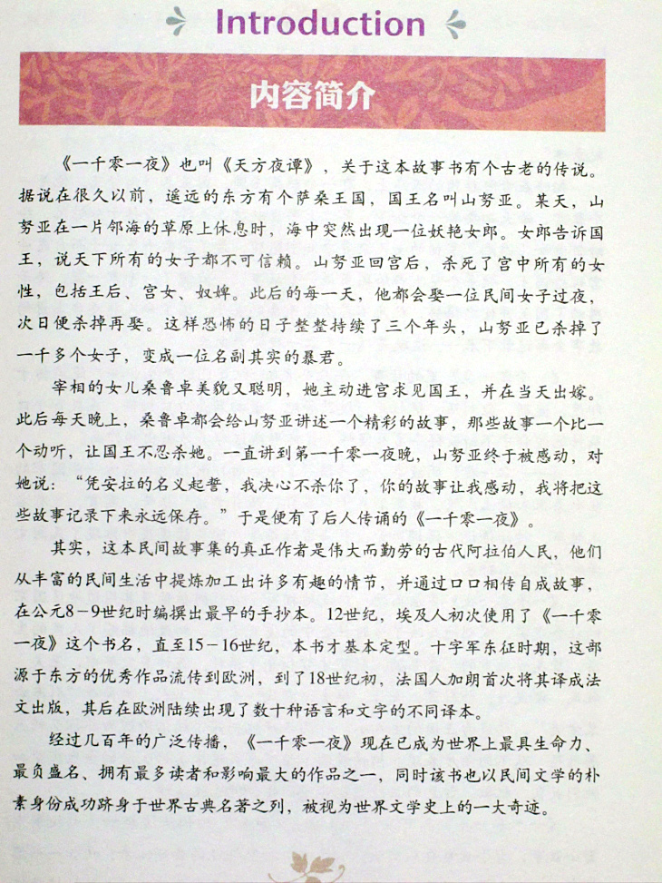其实,这本民间故事集的真正作者是伟大而勤劳的古代阿拉伯人民,他们从丰富的民间生活中提炼加工出许多有趣的情节,并通过口口相传自成故事,在公元8—9世纪时编撰出早的手抄本。12世纪,埃及人初次使用了《一千零一夜》这个书名,直至15一16世纪,本书才基本定型。十字军东征时期,这部源于东方的优秀作品流传到欧洲,到了18世纪初,法国人加朗首次将其译成法文出版,其后在欧洲陆续出现了数十种语言和文字的不同译本。