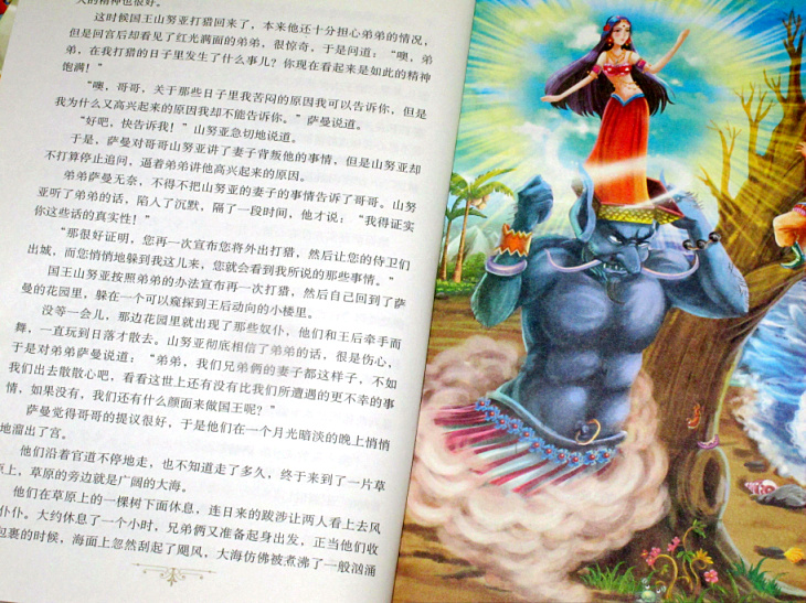 后来有**,处理完公务的国王山努亚忽然想起了久未见面的弟弟萨曼,于是命令宰相去请弟弟前来王宫叙叙兄弟情谊。 宰相带着命令来到撒买干第国,把国王的邀请转述给了萨曼。萨曼也很想念自己的哥哥,于是,在稍做准备后,就跟随宰相一起踏上了前往王宫的道路。 还没走出多远,萨曼忽然想起有一样东西忘在了宫里,于是转过马头回宫去拿。 他走在王宫干净的大道上,想着不久后就可以见到哥哥,心情十分高兴,仿佛是为了给他的好心情伴奏,远处传来了悠扬的乐声。 “哪里的乐声?”萨曼忽然停下了脚步,脸上的笑容被疑惑代替,“这乐声分明是从宫中而来啊!”他心里想着,“难道王后或者王子过生日?明明不是这个时候啊?”他快步地赶到宫里,一眼就看见自己的王后混在一群乐师中间,和他们嬉戏打闹,纵情享乐。 “这个贱人!我还没走出两里地他们就已经这样子,如果我去往国都,这些人岂不是要把王宫闹翻天!”盛怒之下的萨曼手起刀落,几下就把王后和乐师杀了个干干净净,然后心情悲痛地赶往国都。 一路上萨曼都没有说话,只是低头不停地赶路,心里的悲痛让他没有心情观赏沿途美丽的风景,不知过了多久,他们到达了国都外。 国王山努亚早就等候在了城外,看见自己的弟弟出现在视野里,他迫不及待地就迎了上去。兄弟俩见了面好一阵寒暄,山努亚絮絮叨叨地说起分别后的情况,从**大事谈到升斗小民,从官里谈到宫外——但是无论山努亚讲的事情多么幽默有趣,萨曼却一直都是郁郁寡欢的样子。 “噢!我亲爱的弟弟,你这是怎么了?怎么如此不快乐?”国王山努亚不无担心地问道。 “唉!”萨曼叹了口气,说道,“哥哥你就不要问了。” 国王山努亚以为弟弟是想念他的妻儿,于是也不再追问。在其后的几天里,国王山努亚天天都找弟弟萨曼聊天谈心,试图减轻他心里的思念之苦,然而萨曼却还是闷闷不乐,食欲不振,面容**天的消瘦了下去。国王山努亚实在是忍不住了,又问道:“我亲爱的弟弟,我不忍心看你这样消沉下去,告诉我吧,告诉我你到底怎么了?” “我敬爱的哥哥,您就别勉强我了,我心里的痛苦,没人能够理解!”萨曼愁闷地说道。 “不如这样,弟弟,我们一起出去打猎散散心吧!”国王山努亚建议道。 然而萨曼实在没有心情去打猎,他始终想着妻子背叛他的事。见弟弟不愿意,国王山努亚只好带着自己的侍卫去打猎。 萨曼留在了宫里,整天看着落花独自神伤。这天他又在院子里徘徊,院子里的落叶漫天飞舞,像是没有母亲的孩子一样找不到归宿,萨曼觉得自己也像是落叶,虽然有一个哥哥,可是他仍旧觉得自己是孤单一人,正当他伤心得快掉泪的时候,他忽然听见隔壁花园传来阵阵欢笑的声音。 萨曼想看看是哪些人如此快活地生活着,就登上了一座小楼眺望那座花园。花园里有许多人,他们围着喷水池尽情歌舞,从衣着上萨曼判断他们基本上都是王宫的奴仆,只有中间那个女子除外,她穿着华丽的衣裳,并且打扮得十分妖艳。 “噢,我的天!”萨曼忽然惊叫出声,原来他看清楚了那个女子,她居然是自己的嫂子,也就是国王山努亚的妻子!她居然和这些下人在一起厮}昆! 萨曼惊讶不已,原来哥哥的王后居然也如此不检点。他忽然想起了自己的王后,比起哥哥的妻子,自己的妻子已经算不错了。 从那以后,萨曼就高兴起来,食欲渐长,身体越长越结实,整个人的精神也很好。 这时候国王山努亚打猎回来了,本来他还十分担心弟弟的情况,但是回宫后却看见了红光满面的弟弟,很惊奇,于是问道:“噢,弟弟,在我打猎的日子里发生了什么事儿?你现在看起来是如此的精神饱满!” “噢,哥哥,关于那些日子里我苦闷的原因我可以告诉你,但是我为什么又高兴起来的原因我却不能告诉你。”萨曼说道。 “好吧,快告诉我!”山努亚急切地说道。 于是,萨曼对哥哥山努亚讲了妻子背叛他的事情,但是山努亚却不打算停止追问,逼着弟弟讲他高兴起来的原因。 弟弟萨曼无奈,不得不把山努亚的妻子的事情告诉了哥哥。山努亚听了弟弟的话,陷入了沉默,隔了一段时间,他才说:“我得证实你这些话的真实性!” “那很好证明,您再一次宣布您将外出打猎,然后让您的侍卫们出城,而您悄悄地躲到我这儿来,您就会看到我所说的那些事情。” 国王山努亚按照弟弟的办法宣布再一次打猎,然后自己回到了萨曼的花园里,躲在一个可以窥探到王后动向的小楼里。 没等一会儿,那边花园里就出现了那些奴仆,他们和王后牵手而舞,一直玩到日落才散去。山努亚彻底相信了弟弟的话,很是伤心,于是对弟弟萨曼说道:“弟弟,我们兄弟俩的妻子都这样子,不如我们出去散散心吧,看看这世上还有没有比我们所遭遇的*不幸的事情,如果没有,我们还有什么颜面来做国王呢?” 萨曼觉得哥哥的提议很好,于是他们在一个月光暗淡的晚上悄悄地溜出了宫。 他们沿着官道不停地走,也不知道走了多久,终于来到了一片草原上,草原的旁边就是广阔的大海。P8-10
