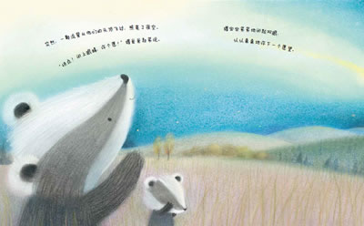拉着父亲的手,獾宝宝看到了夜色多彩,看到了金色的流星,看到了高悬的北极星…… 最后獾宝宝在在爸爸的怀抱中安静地睡着了。