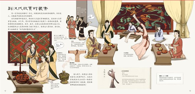 《服饰打开祖先的衣橱/中国国家博物馆儿童历史百科绘本》用简洁有趣的文字,精美的手绘大图和文物实景图片,介绍了从远古世界到新时代各时期的男女服饰,如春秋战国时期的深衣、汉代的袍、唐代的襦裙、明代的霞帔等,同时也介绍了服饰随着时代的变化呈现出的不同特点,如唐代服饰的雍容华美,宋代服饰的清新质朴等。绘本以服饰为载体,反映出中国社会政治、经济、文化等多方面的社会变迁。通过本书的阅读,孩子们将对中国古代服饰文化的演进有一个基本的了解。