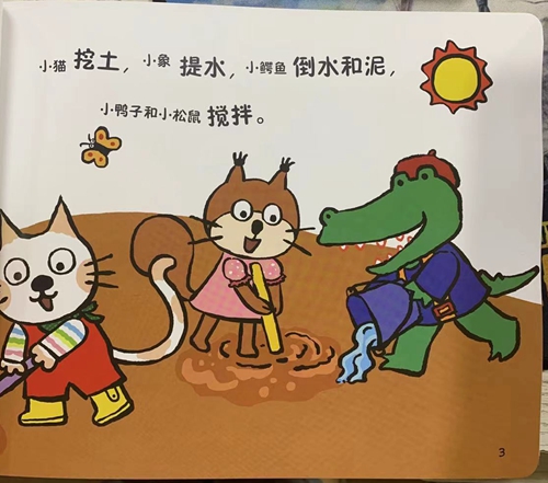 小猫挖土,小象提水,小鳄鱼倒水和泥,小鸭子和小松鼠搅拌。