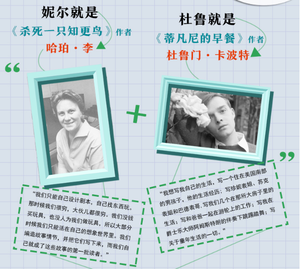 某个夏天,在美国小城门罗维尔,争强好胜的假小子妮尔遇见了穿着考究、喜欢看书,也喜欢恶作剧的捣蛋鬼杜鲁。 性格古怪的两人很快成为了好朋友。他们有时会在树屋中度过漫长的下午,阅读推理小说,在妮尔父亲的打字机上写自己的故事;有时会一起调查小镇的盗窃案,教训欺负弱小的恶霸。 长大后,他们成为了美国著名的作家——杜鲁门·卡波特与妮尔·哈珀·李。前者在24岁时就凭借《蒂凡尼的早餐》奠定了大师的地位。后者则写出了文学经典《杀死一只知更鸟》,该书成为美国青少年的之书。 这段不可思议的友谊,要从门罗维尔的那个夏天讲起……
