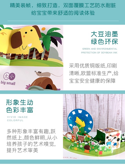 以日常生活中的常见事物为背景,通过孩子喜爱的各种卡通形象,让孩子以触摸、拉伸、折叠等动作,认知形状、颜色、大小、数字等概念,在边学边玩中提升视觉、触觉等感知能力。每个认知概念均配有中英双语,让孩子在认知概念的同时,初步学习语言知识。