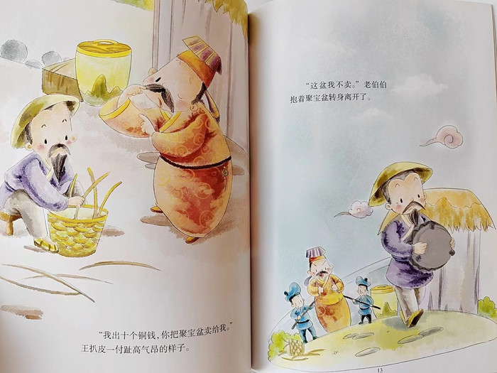 讲述一位老伯伯偶得了一只聚宝盆,财主王扒皮得知此事,想要强抢,便向县太爷告状。而县太爷见到神奇的聚宝盆,心生歹意,最终抢占了聚宝盆。一日,县太爷的父亲不慎掉入盆中,县太爷见状急忙救父。可笑的是,县太爷竟从聚宝盆中拉出了十个父亲。当县太爷为十个父亲苦恼不堪时,聚宝盆也被摔碎了的故事。