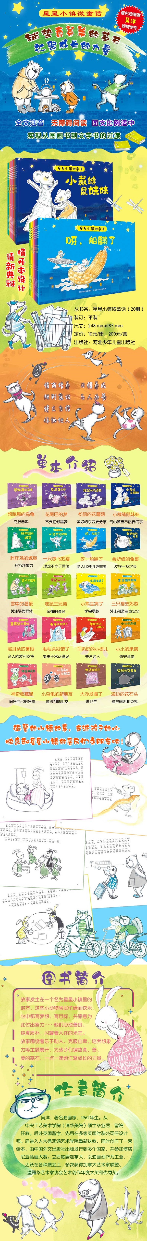 故事发生在一个名为星星小镇里的地方,这些小动物忙碌而快乐,心中都有梦想、有目标,并愿意为此付出努力——小裁缝鼠妹妹一心想做出世界上最美的礼服、鼠哥哥梦想着赢得划船比赛、小海龟想为老去的爷爷画一幅画、大耳朵熊爸爸宁可自己受冻也要帮助更弱小的动物、井底之蛙渴望去看看外面的世界……动物小镇的居民们心地善良、纯真质朴,闪耀着人性的光芒。故事围绕着乐于助人、克服自卑、培养想象力等主题展开,有助于孩子提高情商,养成好习惯。