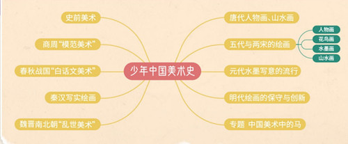 六千年前的美术 商周时期的“模范”美术 春秋战国时期的“白话文”美术 秦汉时期的写实绘画 魏晋南北朝的乱世美术 唐代的人物画、山水画 五代与宋代的绘画 会说话的中国花鸟画 自然雄浑的中国山水画 中国文人的水墨画 水墨写意的流行时代——元代 保守的明代绘画 晚明清初的新美术 中国美术中的马