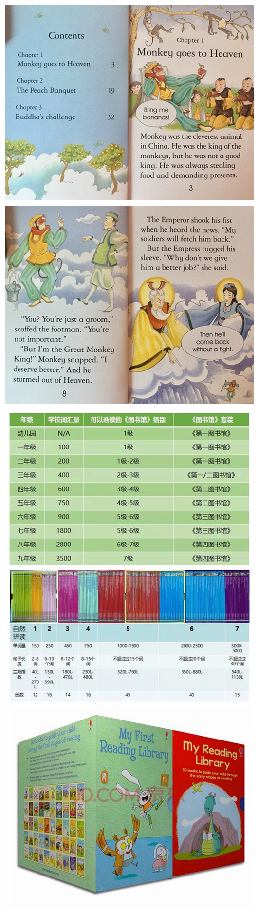 USBORNE图书馆系列到LEVEL5之后,词汇量增加到1000-1500,每页的文字数量在十行左右,共48页,涵盖了英文大部分的语态和时态。从这个级别开始,由图画书逐渐过渡到章节阅读。适合小学五六年级和初中生作为词汇量扩展读本。Level5系列均为世界知名的民间故事和童话故事,学生一般都已接触过中文版本。