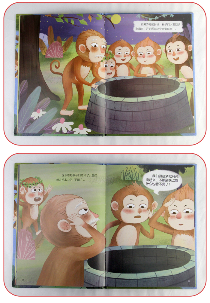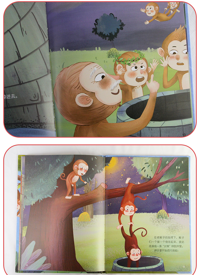 讲述了一群猴子在月下玩耍,猕猴主见井水中有一月亮,于是对同伴说我们应该把它捞出来,于是众猴展转相捉,树弱枝折。。。。。。