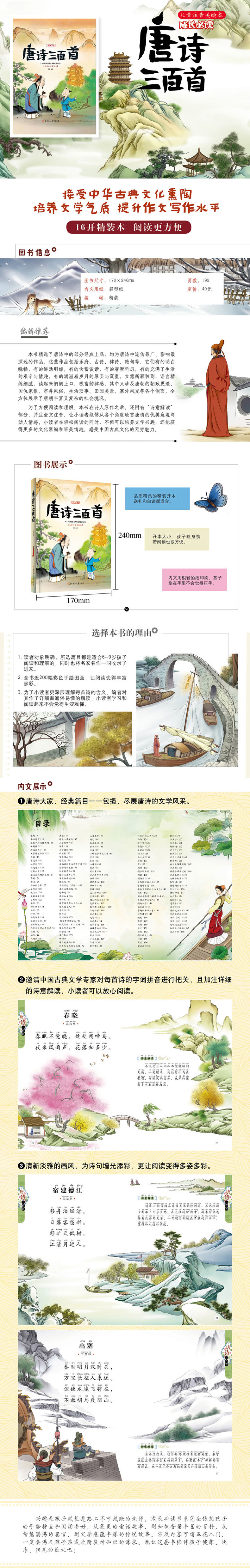这本《唐诗三百首》,甄选适合孩子认知规律的经典古诗。这是适合孩子学习的、容易理解和吟诵、流传广泛的版本。加上通俗易懂的精要讲解,更能培养孩子对诗歌的兴趣。同时配以精美的图画,让孩子可以体会古诗情景交融的美。