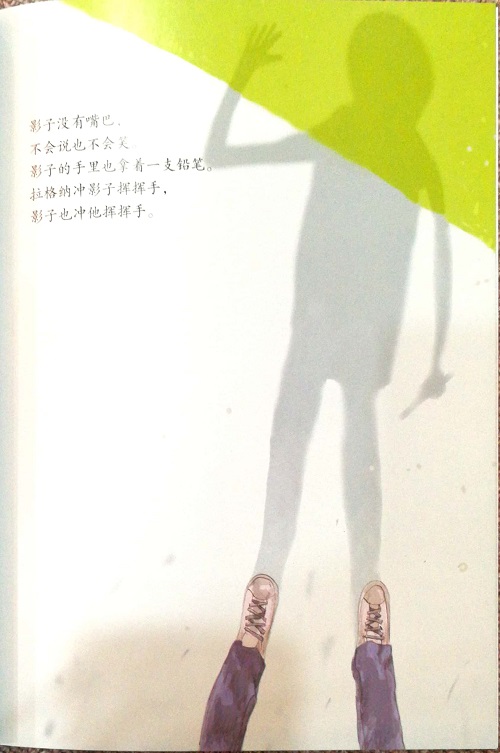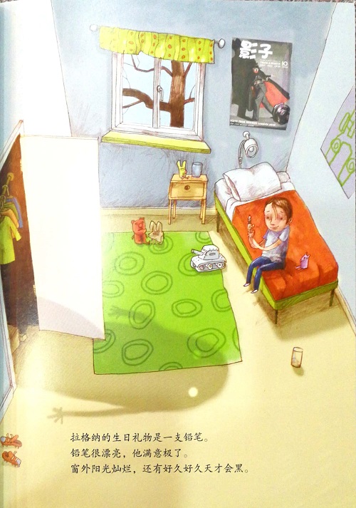 拉格纳的生日礼物是一支铅笔。铅笔很漂亮,他满意极了。窗外阳光灿烂,还有好久好久天才会黑。拉格纳一直在屋外画画。他画了一座房子,一架秋千,还有一家他经常光顾的热狗店。天渐渐黑了,影子越来越长。树枝组成的影子森林里,藏着一座房子。推开门进去,里面充满了拉格纳
